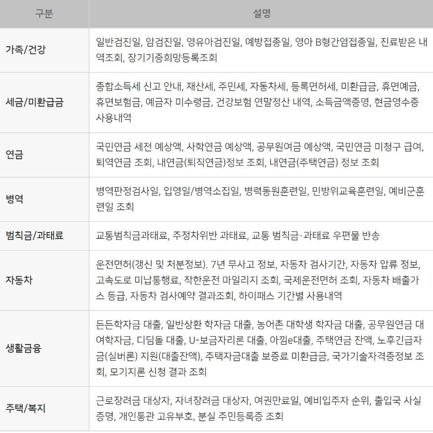 이 서비스를 통해서 건강검진일, 세금, 생활금융 관련 정보들, 자동차와 관련된 면허 갱신일,범칙금 등등 우리가 살아가면서 필요한 다양한 정보들을 한 번에 모아서 확인해 볼 수가 있어요.
