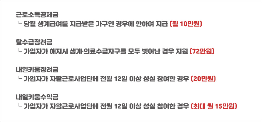 ※ 내일키움장려금 및 내일키움수익금은 자활근로사업단에 참여 중인 가입자에 한해 지급하며, 근로유지형, 인턴·도우미형은 제외