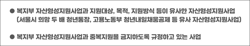 ※ 아동, 청소년 대상의 디딤씨앗통장, 꿈나래통장 등은 중복 참여 가능
